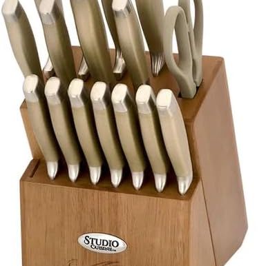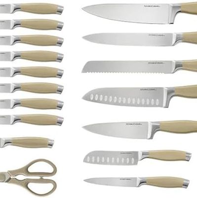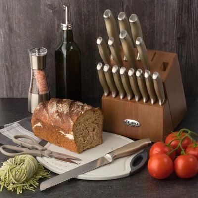 Double bevel cutting edgesHigh-carbon stainless steel bladesSet includes 8” chef's knife, 8” carving knife, 8” bread knife, 7” Santoku knife, 6” chef's knife, 5” Santoku knife, 5” utility knife, (8) 4.5” steak knives, 3.5” paring knife, kitchen shears, and wooden knife block.Stainless steel handles with textured finishHand wash recommended