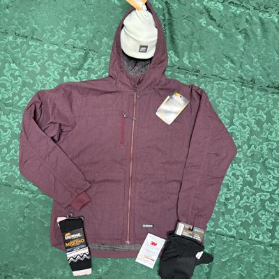 This package starts with a BERNE Winter Coat. Known for its quality, including, triple-needle stitched main seams, Heavyweight quilt-lined taffeta liner, Water-repellent finish, Heavy-duty brass zipper and more! Plus a pair of BERNE water, repellent, work gloves, with 3M Thinsulate and removable finger, Mitt. Add a pair of BERNE wool thermal socks, then Cap it off with a BERNE toque! This is a quality keep you warm package!