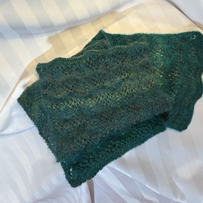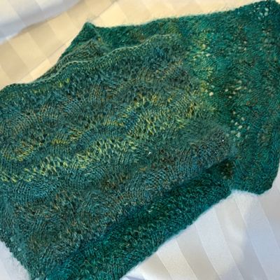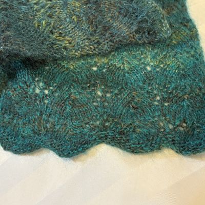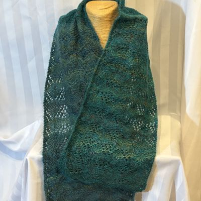 This hand knit scarf, is green with a silver sparkle that does not show up as well in the photos.