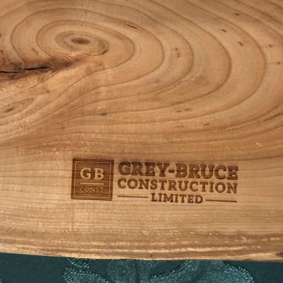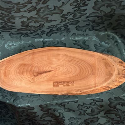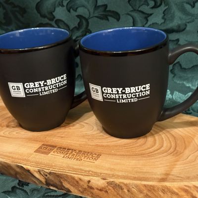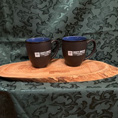 Nice quality mugs with a beautiful live edge serving board. All decorated with a Gray Bruce construction logo.