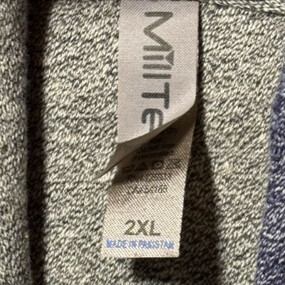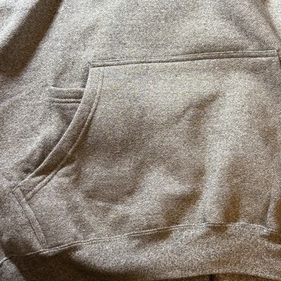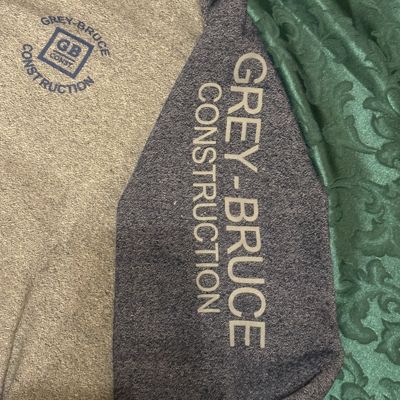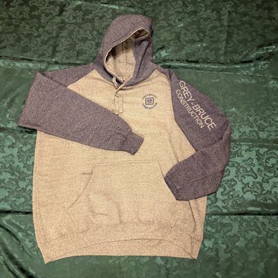 A Very Heavy, Gray Fleece Hoodie Two-Tone 2XL with kangaroo pocket plus an extra pocket inside. Gray Bruce Construction logo on the front left and down the left sleeve.