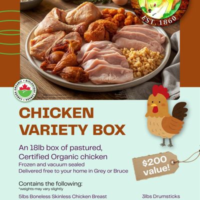 An 18lb box of pastured, Certified Organic chicken
