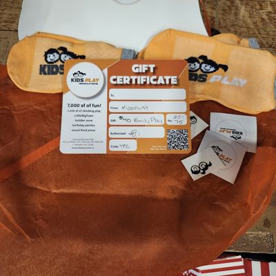 A $40 KidsPlay certificate, two pair of no slip socks, stickers, and more.